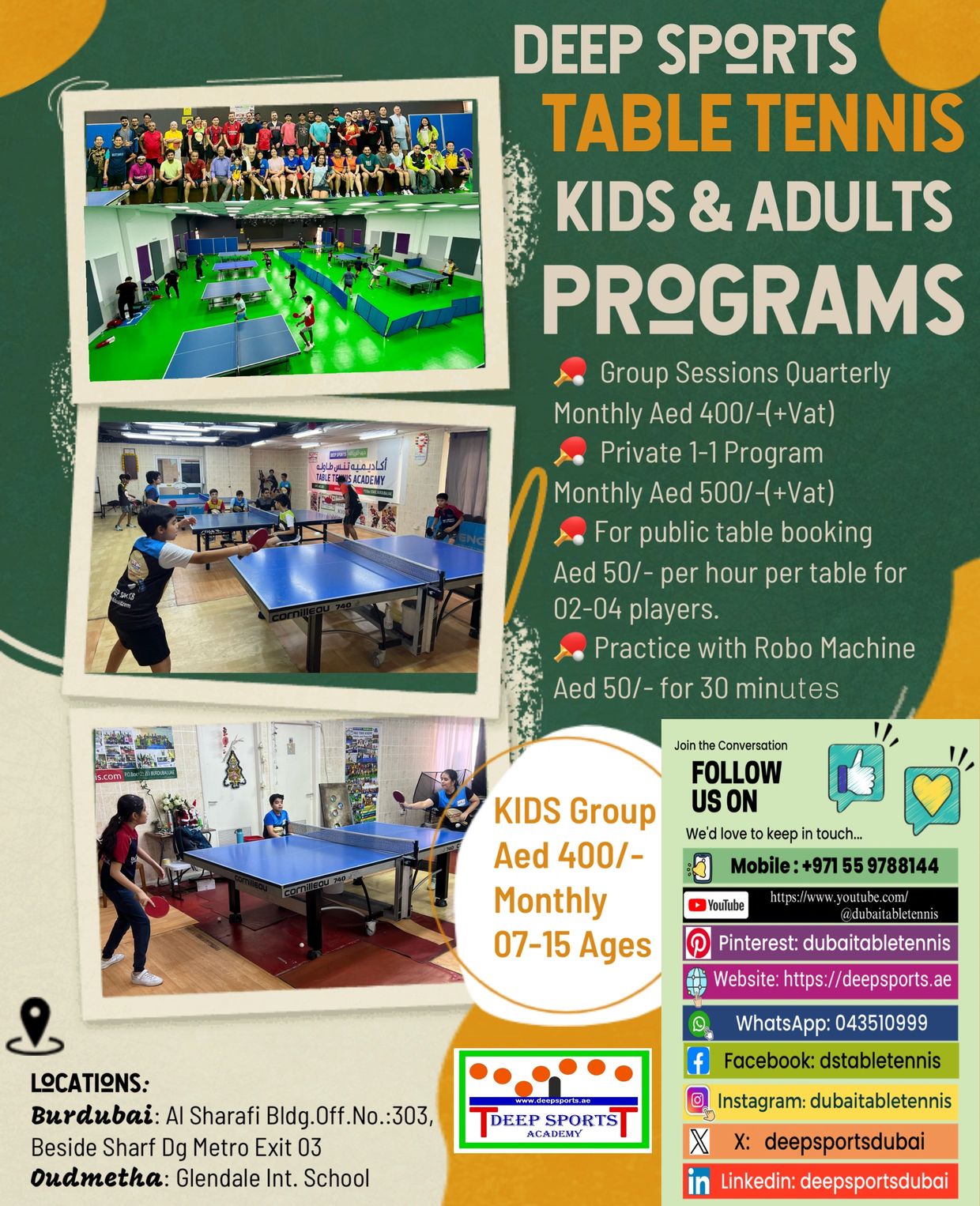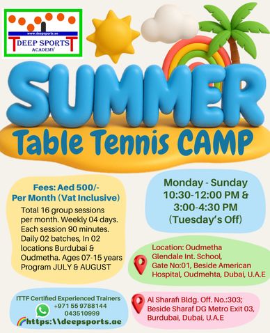 Summer Table Tennis training program for kids 07 to 14 years July & August with 50% discounts in fees. Days Monday to Sunday (Tuesdays off) in Burdubai only. Total 16 sessions in 04 weeks. Fees Aed 500/- (Vat inclusive). Each session 90 minutes. Timings: 10:30-12:00 & 15:00-16:30 hours.